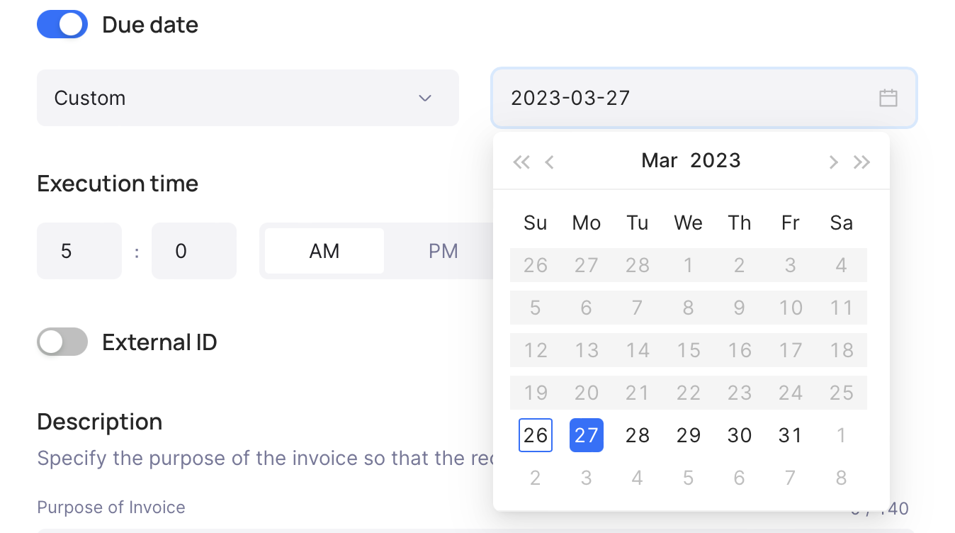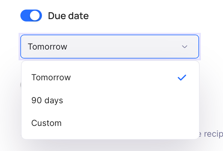 Select the life duration of the invoice. Use our presets or select a desired custom one. If the funds have not been received during the lifetime of the invoice, it will switch to the Archived status.