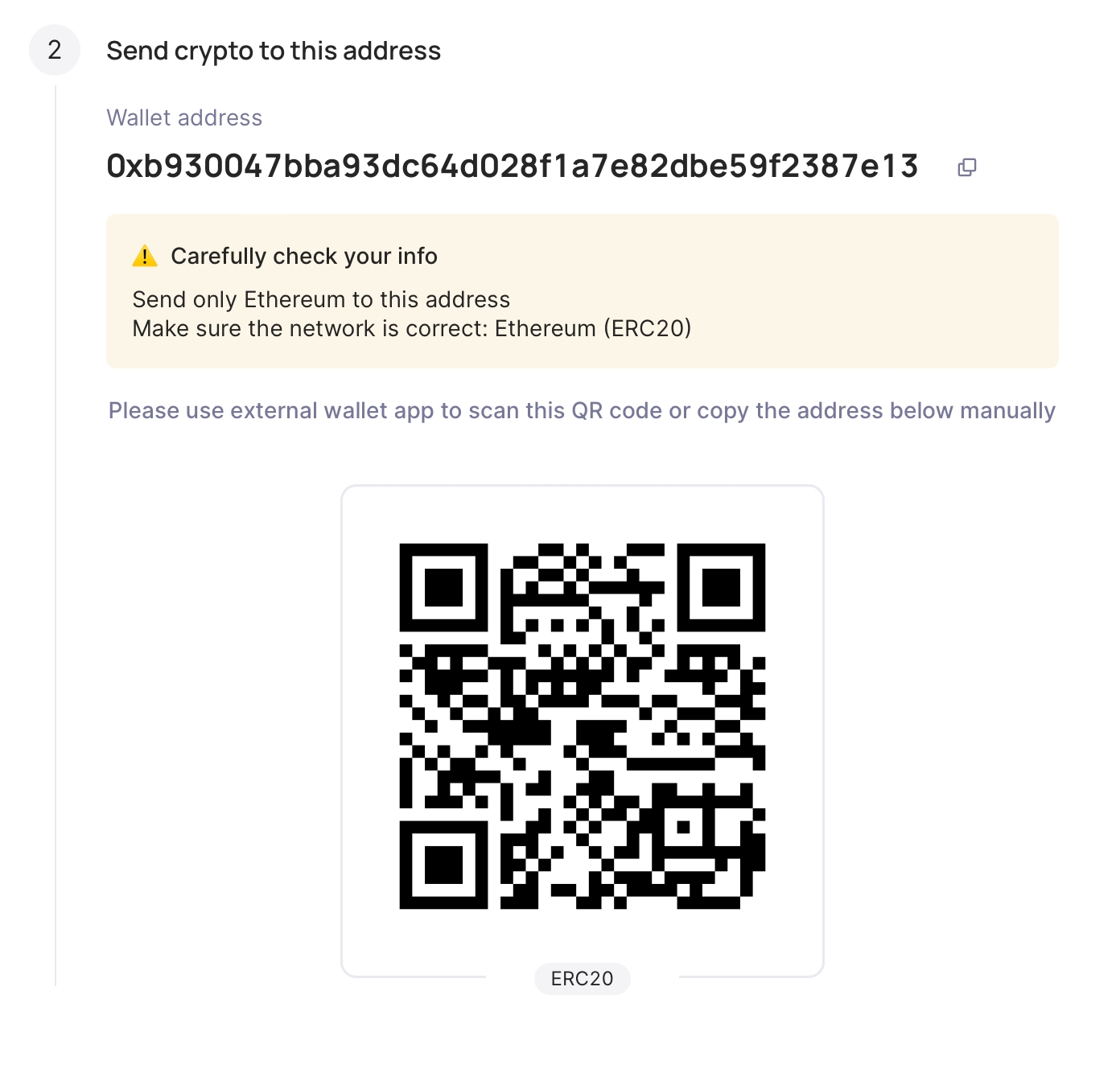 You will see the blockchain address for the deposit. The address can be copied or you can easily use the QR code.