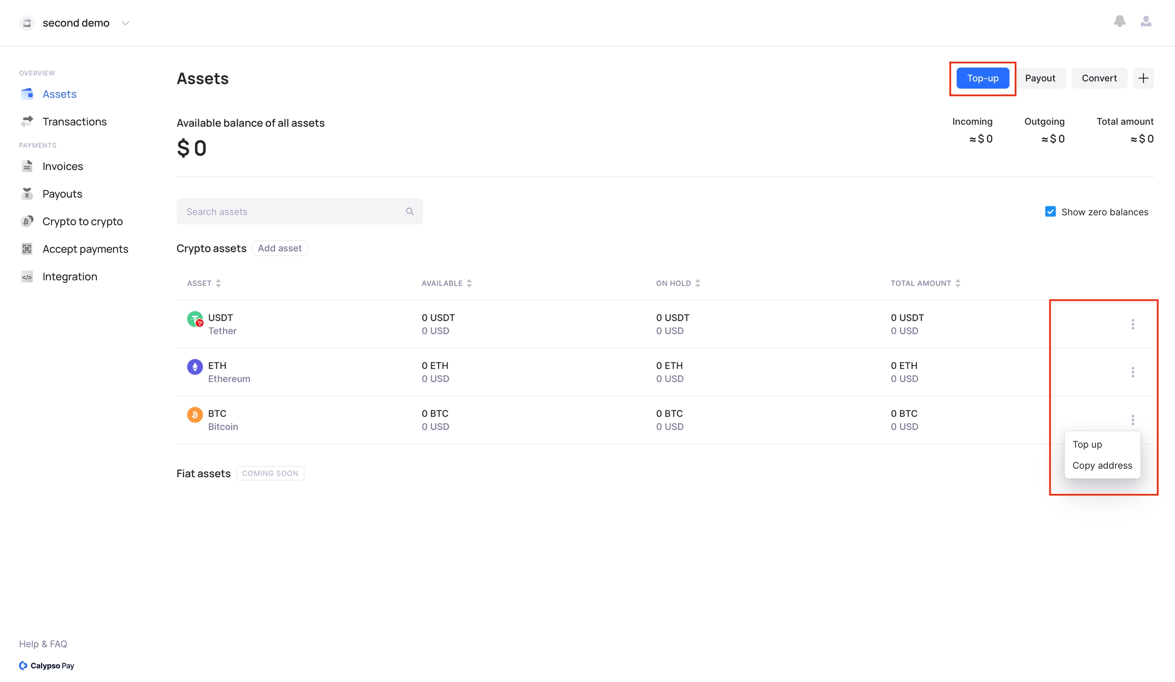 Go to the assets tab and click the "top-up" button or 3 vertical dots on the right side of the chosen currency.