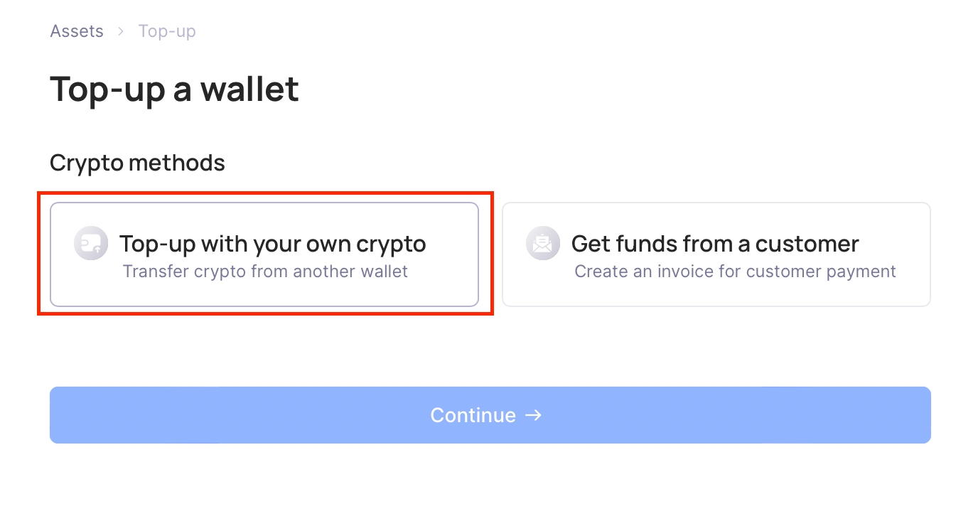 There are several ways to replenish your wallet. You can send funds directly to your wallet address or make an invoice and get funds from your customer. In this article, we will look at the process of direct top-up. For information about creating invoices, read this article