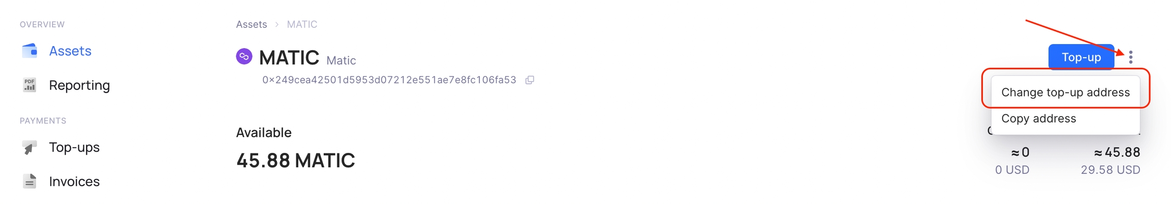 If there is a situation when you want to change the address you use for top-ups of your assets, you can easily do it through our UI. To do it please choose in your left menu "Assets", choose the individual asset you need and on the page of the individual asset page in the right corner there is a three-dot menu, where you can choose an option to change your top-up address.