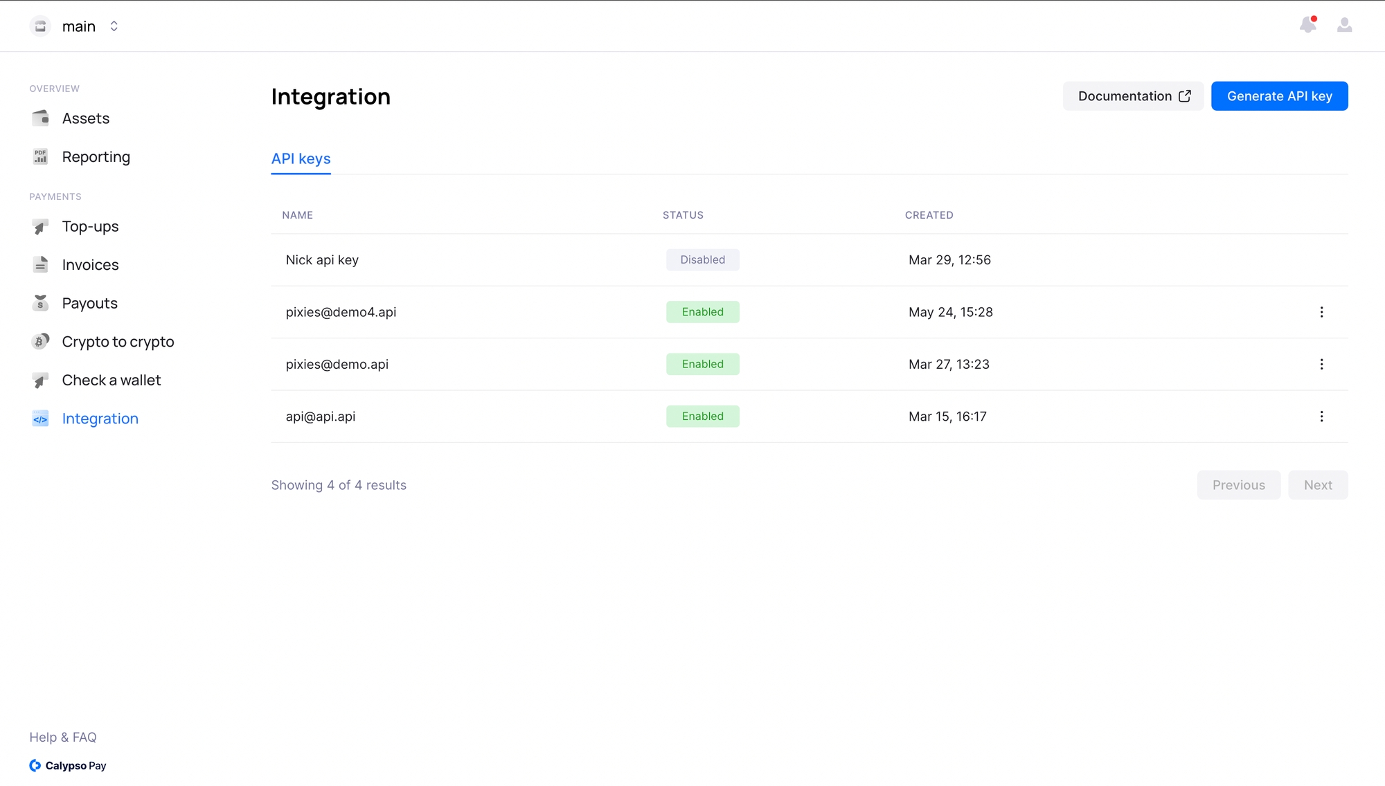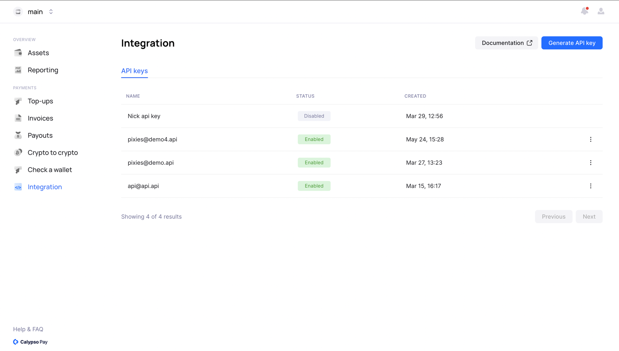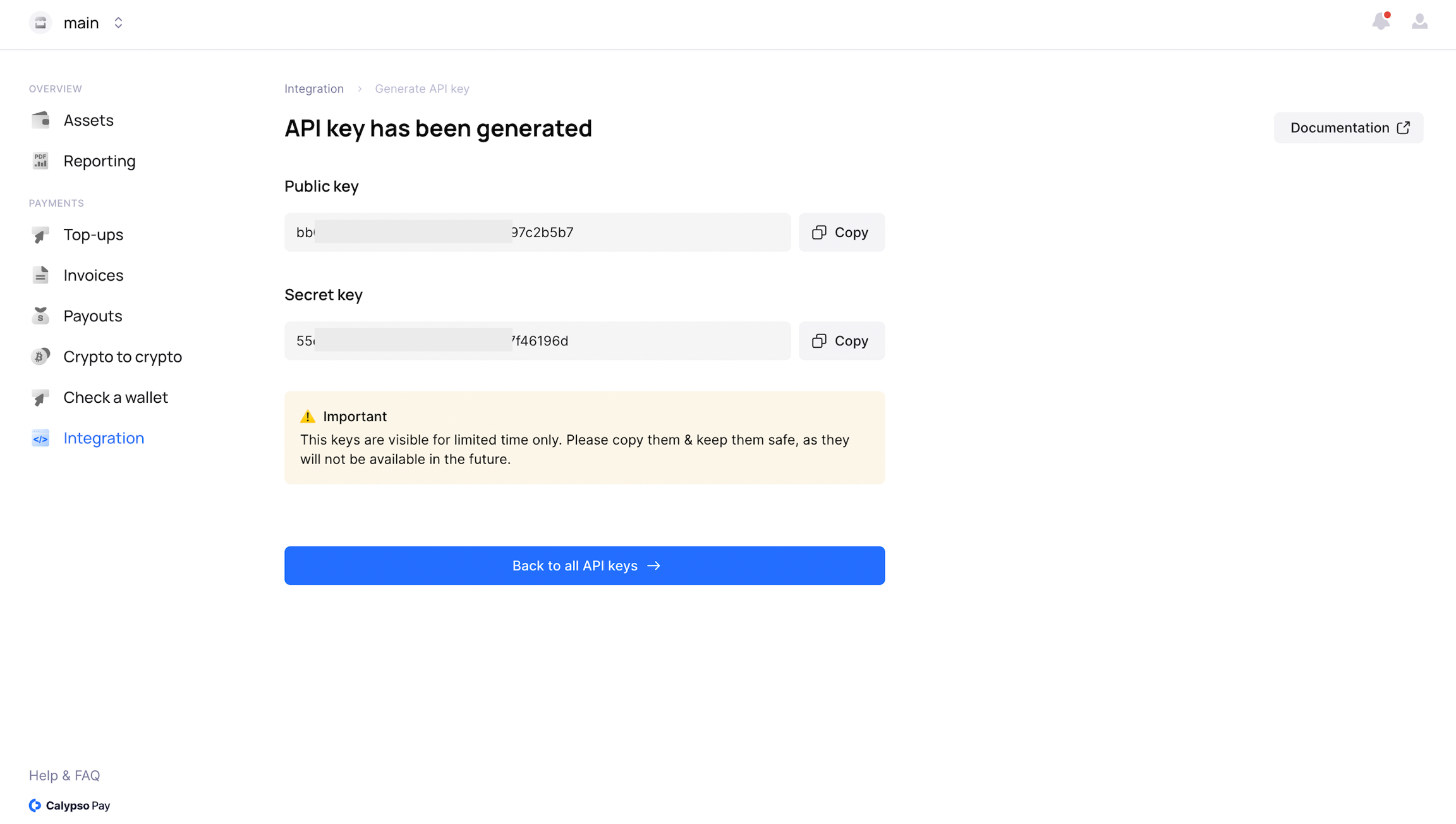 You can generate API keys directly within the Calypso Pay interface. Simply navigate to the Integration section, where you can monitor the status of your keys and create new ones as needed. With API keys, you gain seamless access to Calypso Pay's functionality, enabling smoother integration with your existing systems and applications.