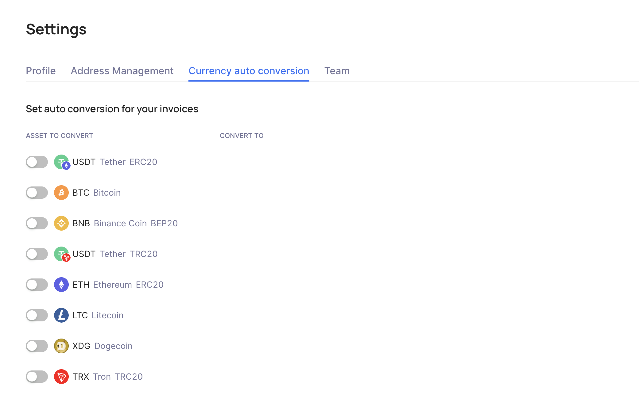 When the toggle is enabled, all incoming payments will automatically convert into the currency you've selected. This allows your users to deposit funds using various methods, while all funds on your account will accumulate solely in the chosen currency.