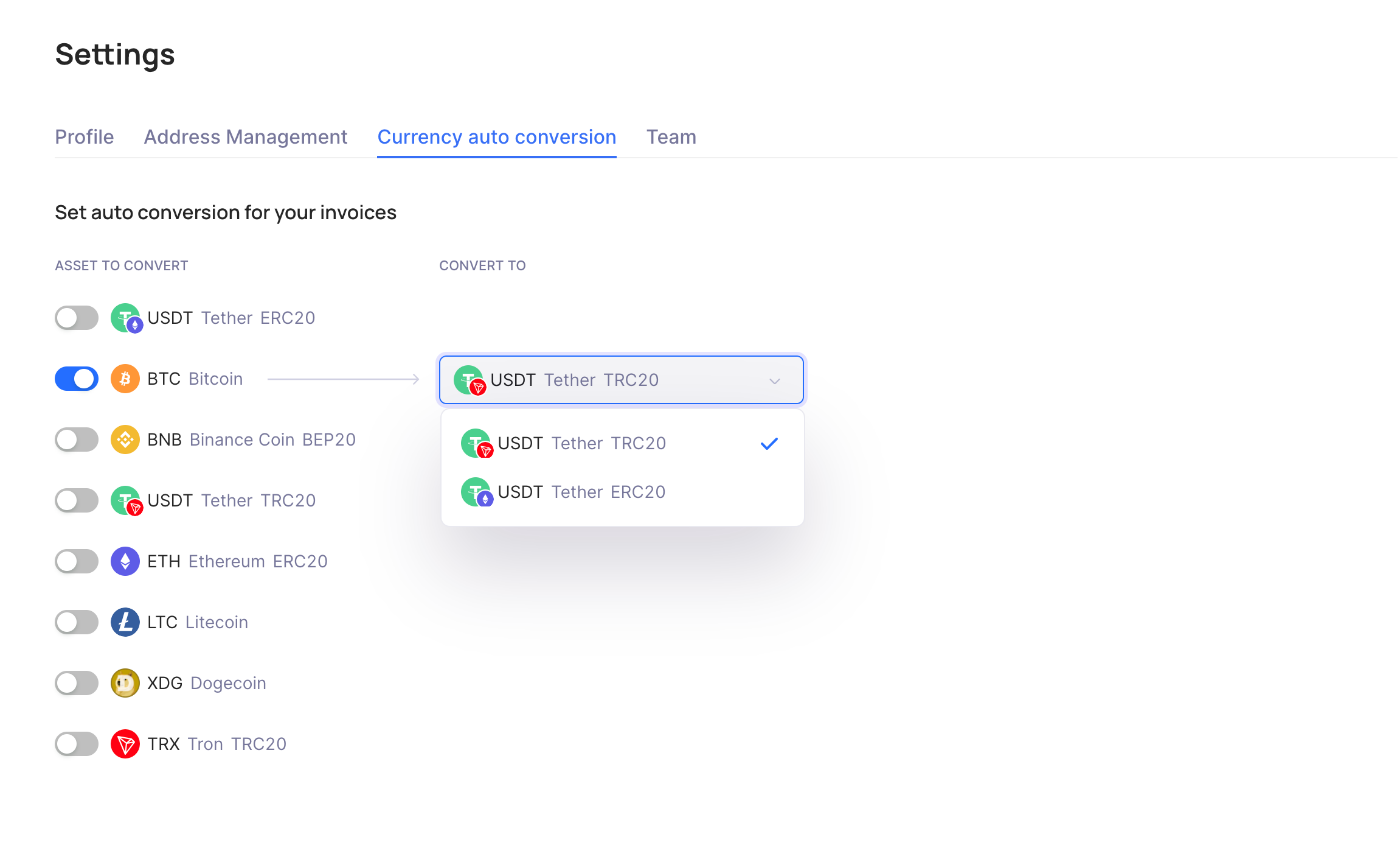 In this scenario, all incoming payments from your clients in BTC currency will automatically convert to USDT (ETH or TRX).