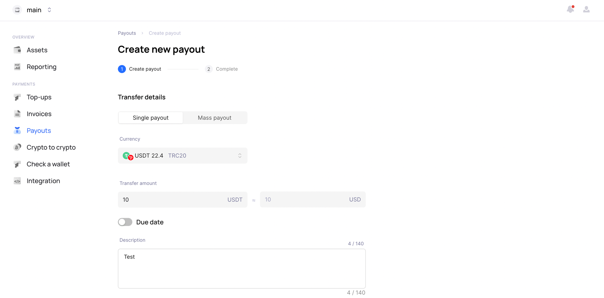 To initiate a transfer, navigate to the "Payout" section. Choose the payout type and enter the amount you wish to transfer.