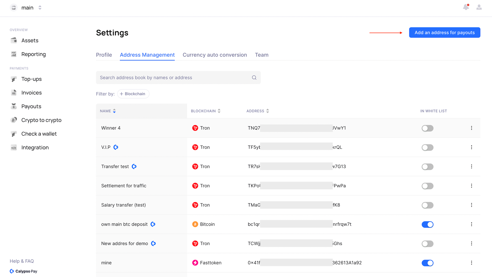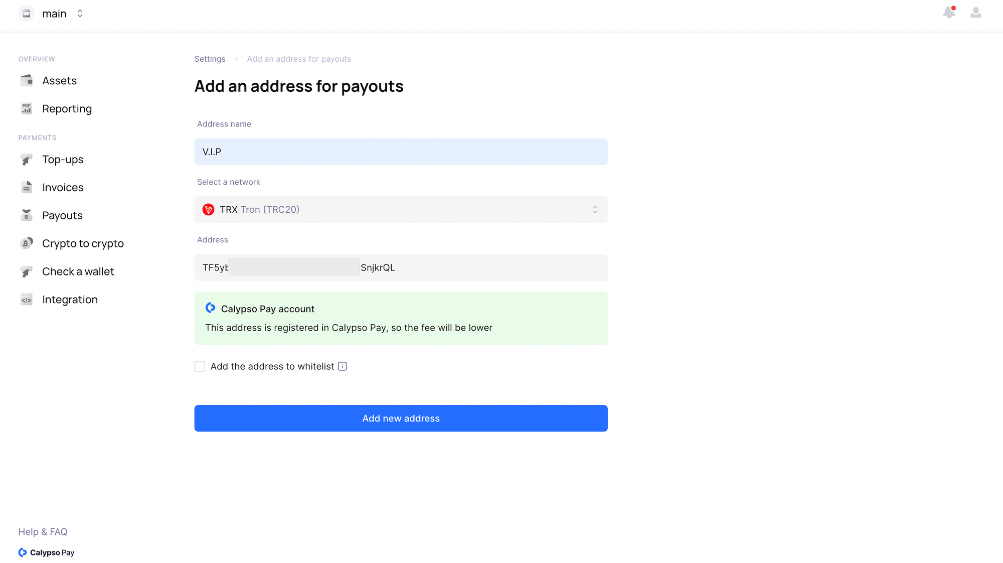 If a Calypso logo appears next to the address upon addition, it signifies that this address is a Calypso Pay client. This feature simplifies the process of identifying Calypso Pay users, ensuring efficient and secure transactions within the platform.