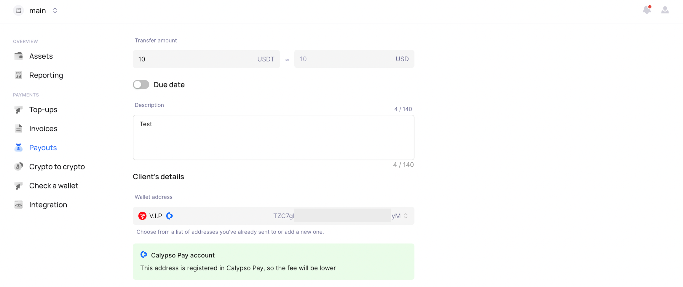 You can take advantage of lower transaction costs by transferring funds to clients who are also Calypso Pay users.