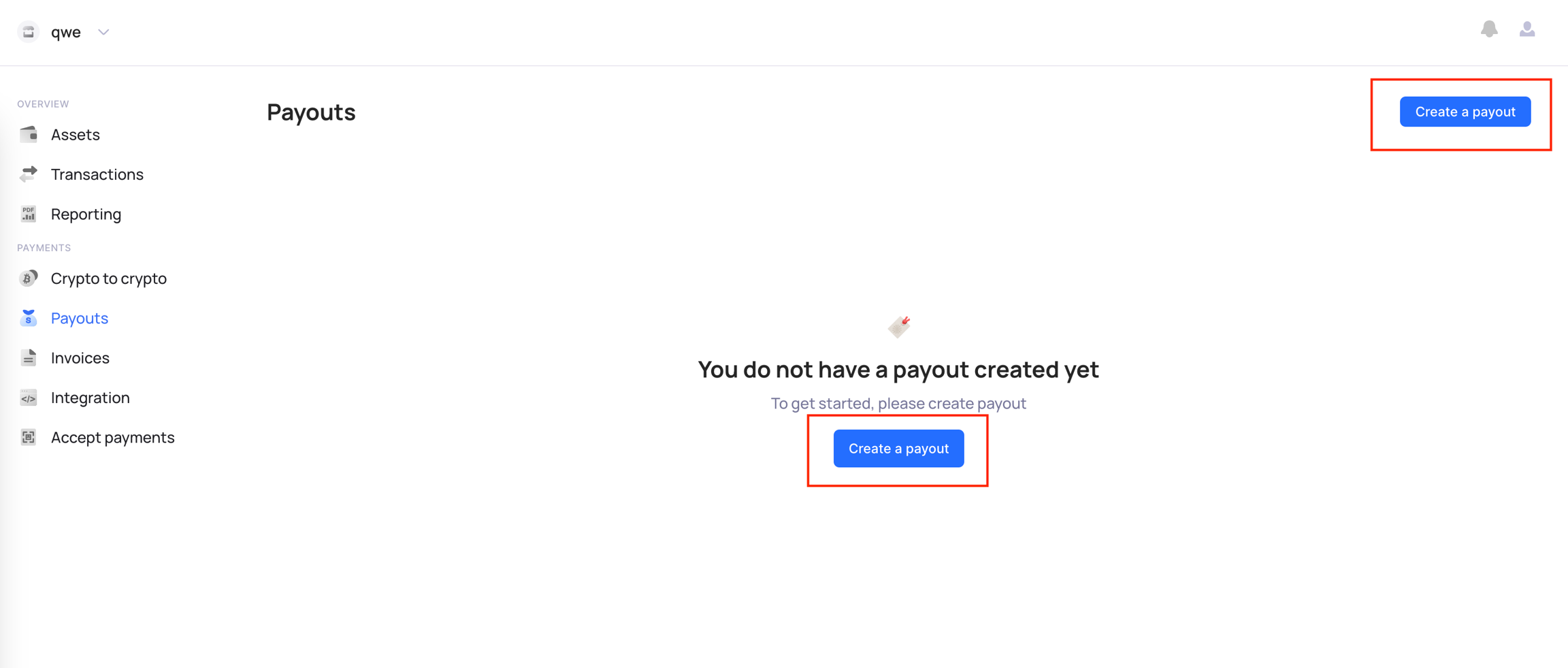 First, go to the "Payouts" tab and click on the "Create a payout" button.