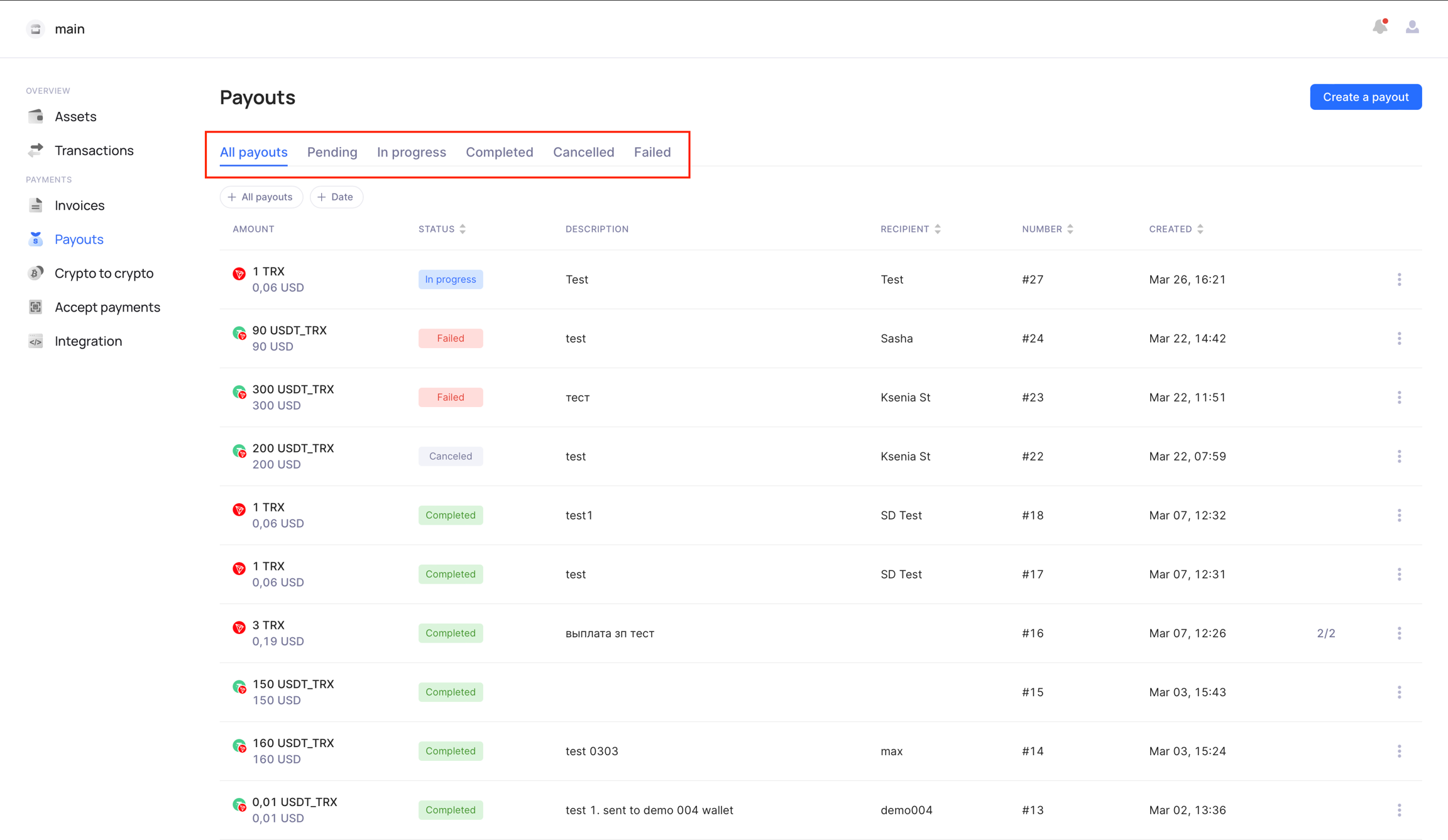 Then you can check all your created payments, their status, and other information in the "Payments" tab. Using status filters or additional filters you can easily find the payout that you need.