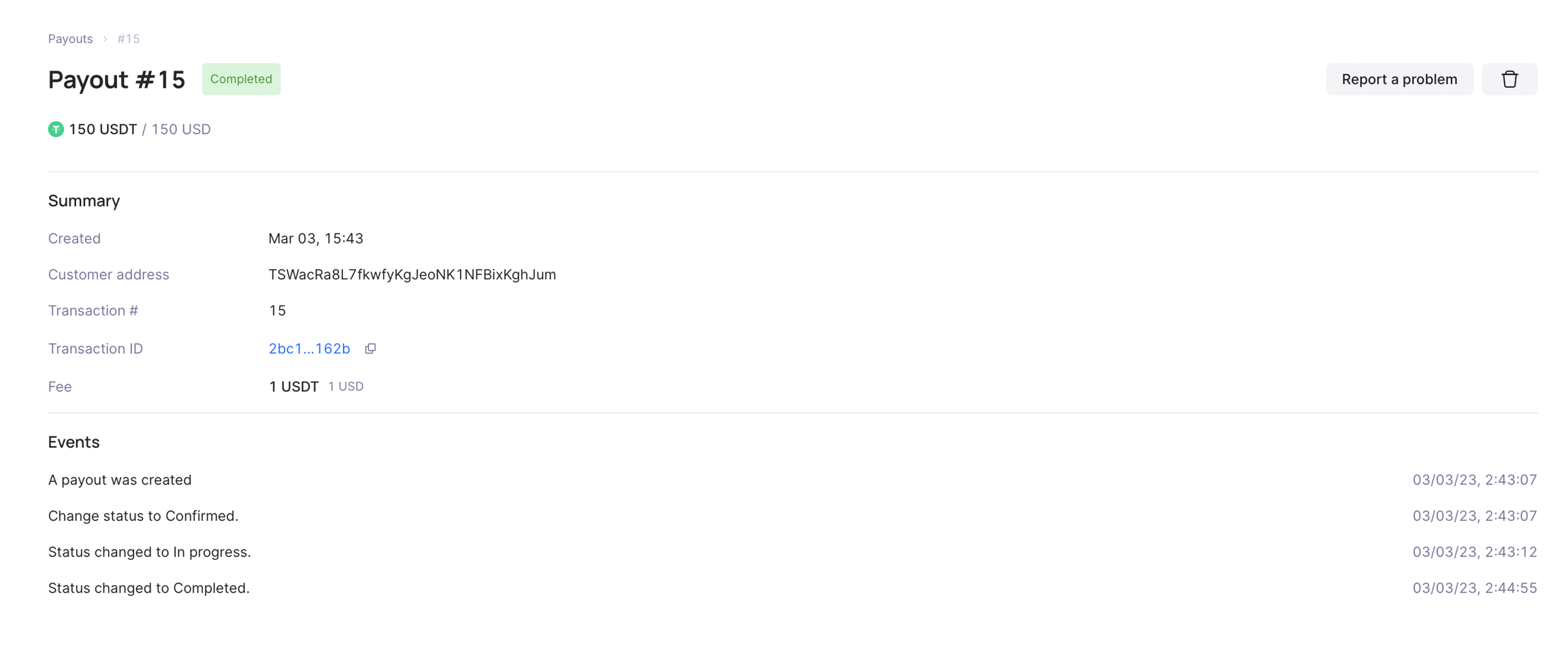 Select the payment you need and in the next window, you can find additional information about payment like transaction hash, customer address, and status lifetime changes.